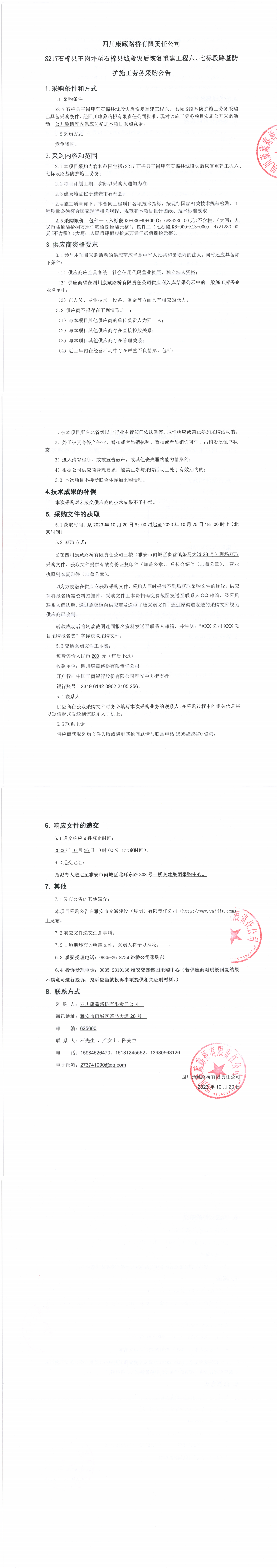 四川康藏路橋有限責任公司S217石棉縣王崗坪至石棉縣城段災(zāi)后恢復(fù)重建工程六、七標段路基防護施工勞務(wù)采購公告