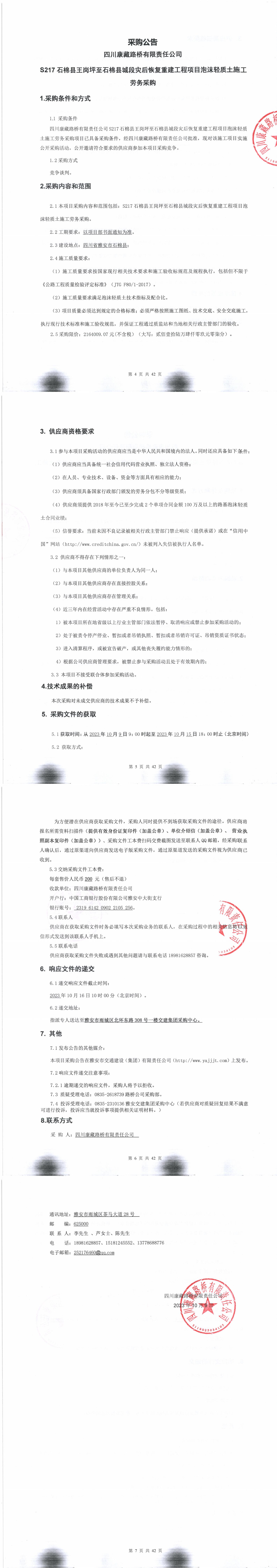 四川康藏路橋有限責(zé)任公司S217石棉縣王崗坪至石棉縣城段災(zāi)后恢復(fù)重建工程項目泡沫輕質(zhì)土施工勞務(wù)采購公告