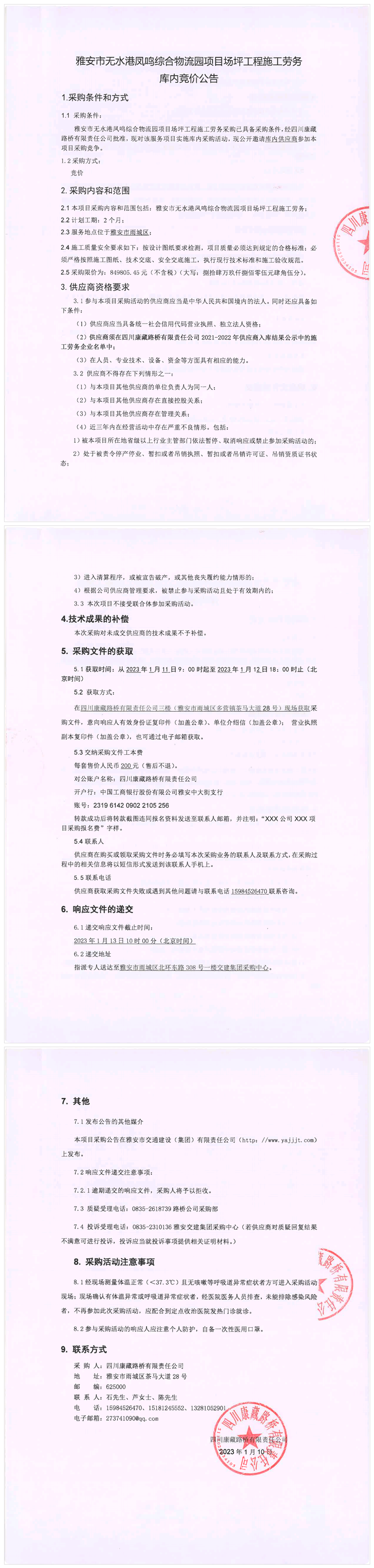 四川康藏路橋有限責(zé)任公司雅安市無水港鳳鳴綜合物流園項目場坪工程施工勞務(wù)庫內(nèi)競價公告