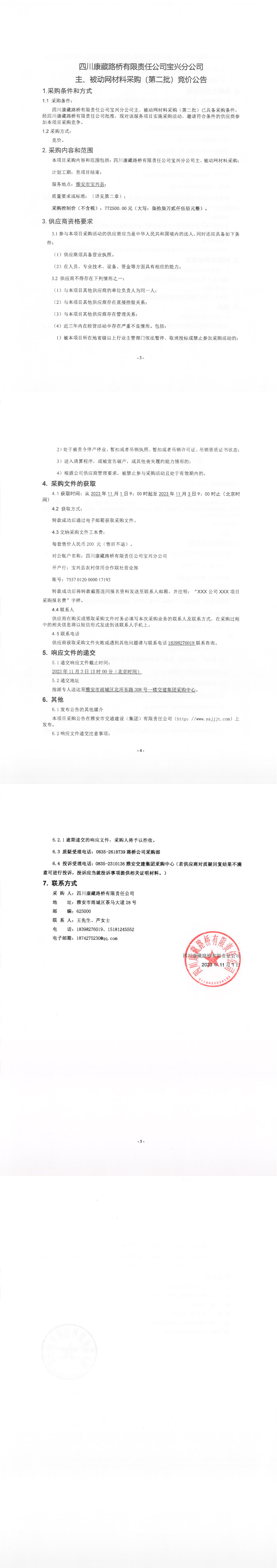 四川康藏路橋有限責(zé)任公司寶興分公司主、被動(dòng)網(wǎng)材料采購(第二批)競(jìng)價(jià)公告