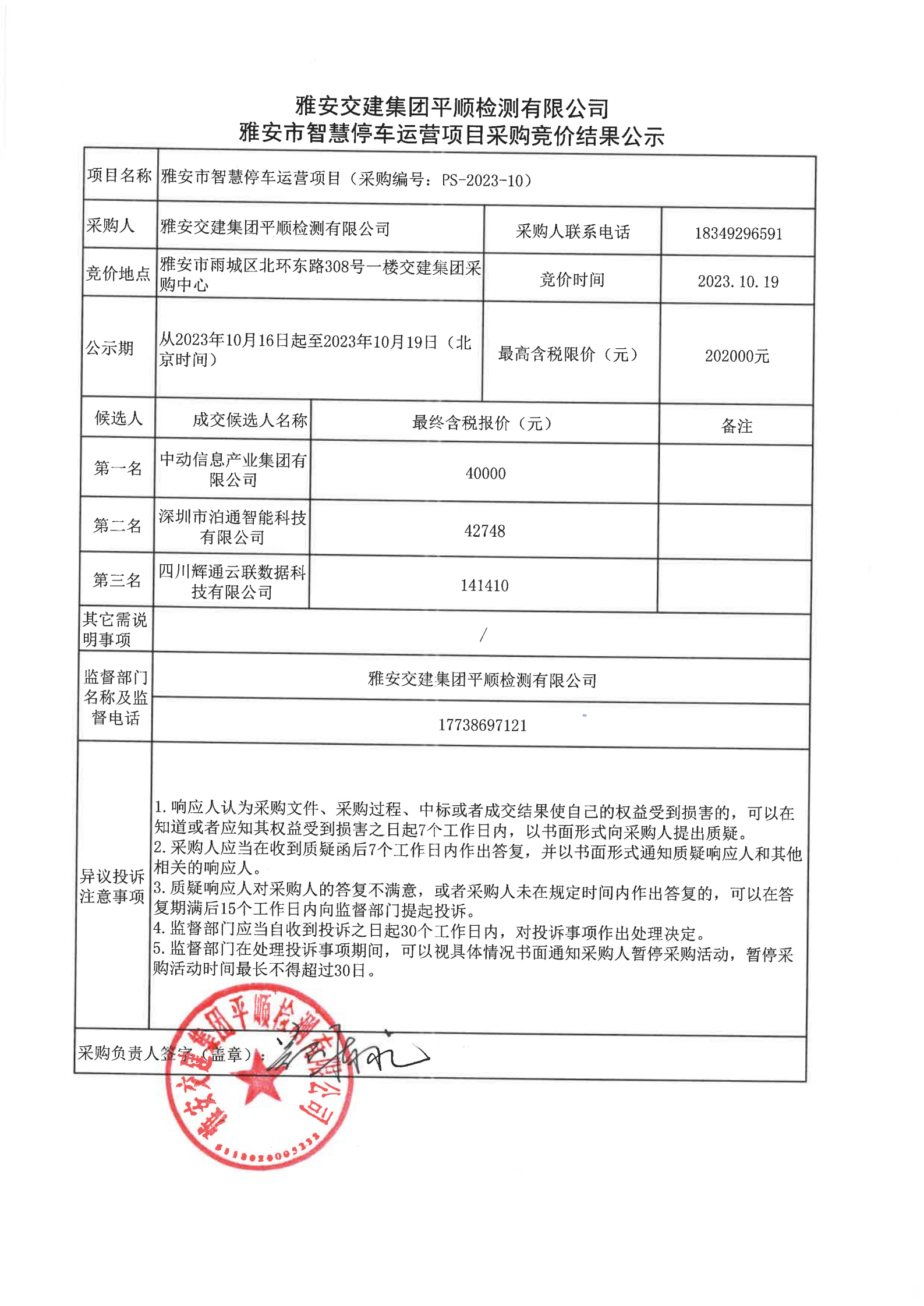 雅安交建集團平順檢測有限公司雅安市智慧停車運營項目采購競價結(jié)果公示