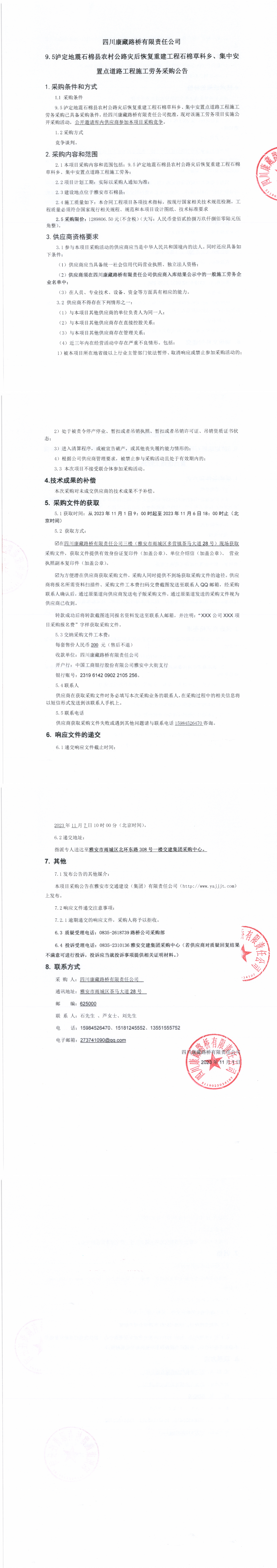 四川康藏路橋有限責(zé)任公司9.5瀘定地震石棉縣農(nóng)村公路災(zāi)后恢復(fù)重建工程石棉草科鄉(xiāng)、集中安置點道路工程施工勞務(wù)采購公告