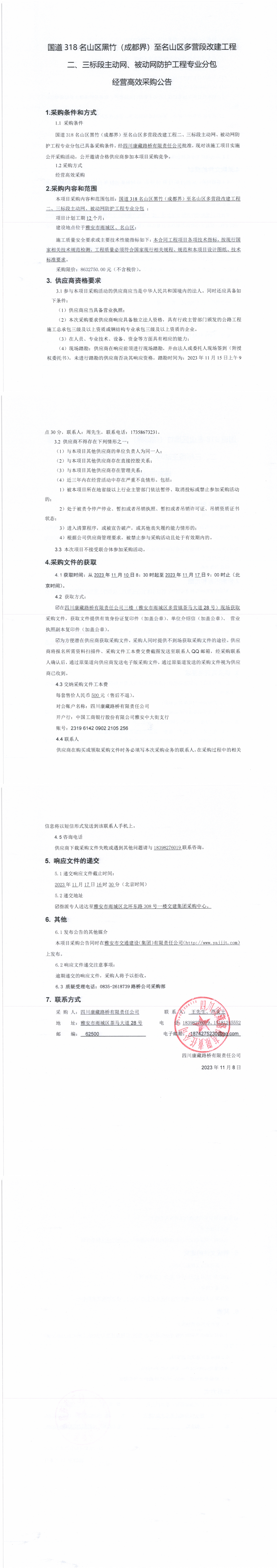 四川康藏路橋有限責任公司國道318名山區(qū)黑竹(成都界)至名山區(qū)多營段改建工程二、三標段主動網、被動網防護工程專業(yè)分包經營高效采購公告