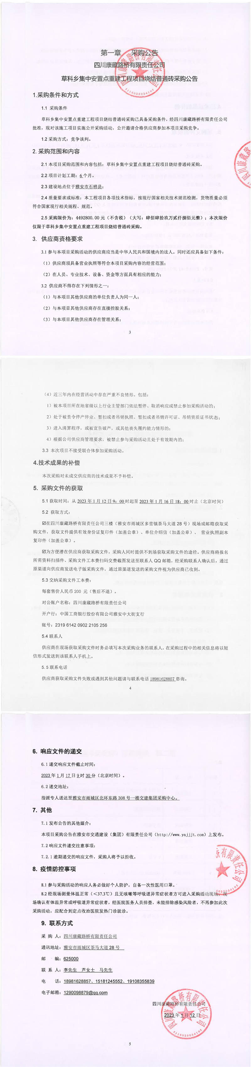 四川康藏路橋有限責(zé)任公司石棉草科鄉(xiāng)集中安置點重建工程項目燒結(jié)普通磚采購公告