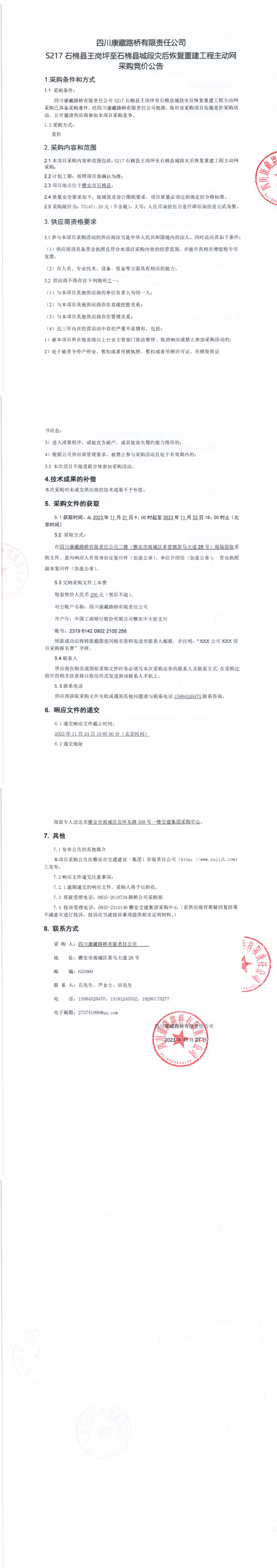 四川康藏路橋有限責(zé)任公司S217石棉縣王崗坪至石棉縣城段災(zāi)后恢復(fù)重建工程主動網(wǎng)采購公告