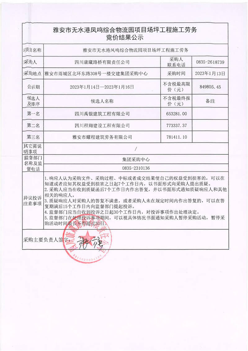 四川康藏路橋有限責任公司雅安市無水港鳳鳴綜合物流園項目場坪工程施工勞務競價結(jié)果公示