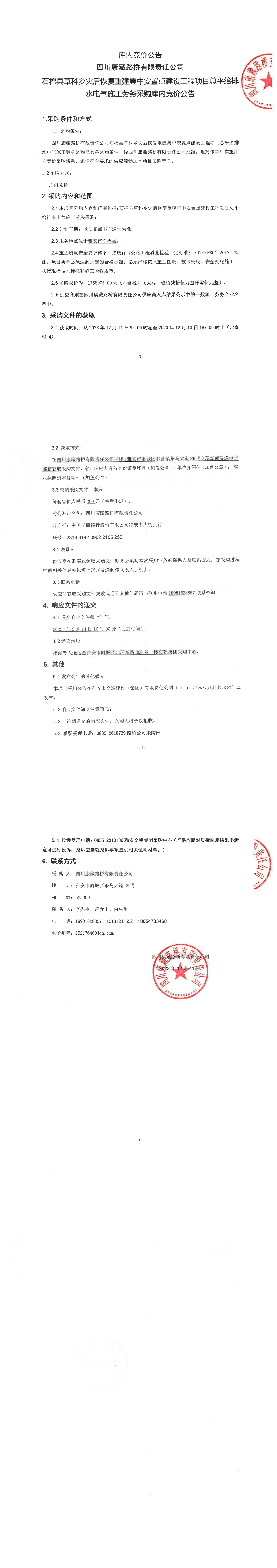 四川康藏路橋有限責任公司石棉縣草科鄉(xiāng)災后恢復重建集中安置點建設工程項目總平給排水電氣施工勞務采購庫內(nèi)競價公告