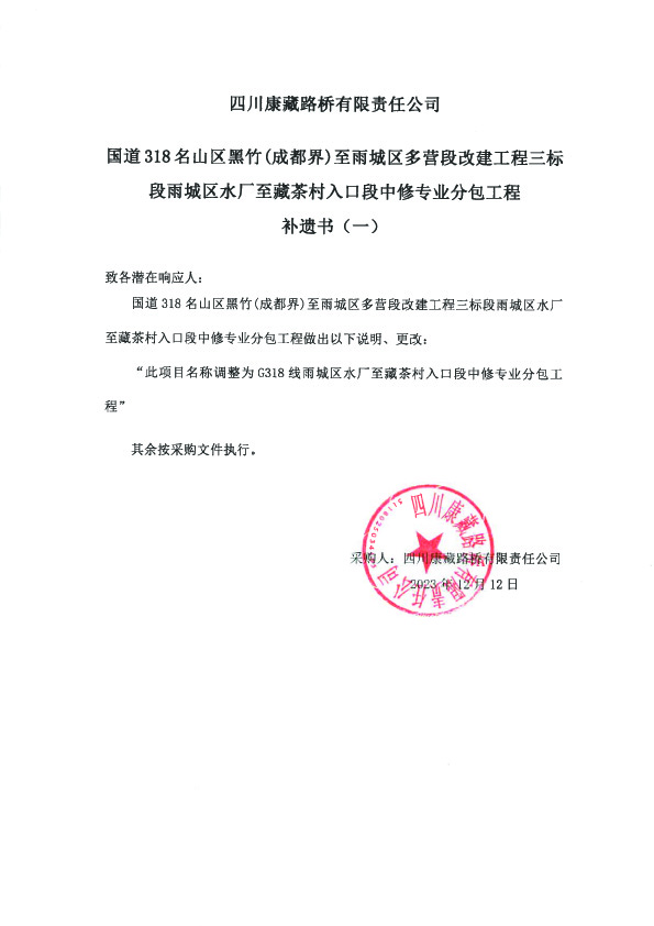四川康藏路橋有限責(zé)任公司國道318名山區(qū)黑竹(成都界)至雨城區(qū)多營段改建工程三標(biāo)段雨城區(qū)水廠至藏茶村入口段中修專業(yè)分包工程(補(bǔ)遺書一)