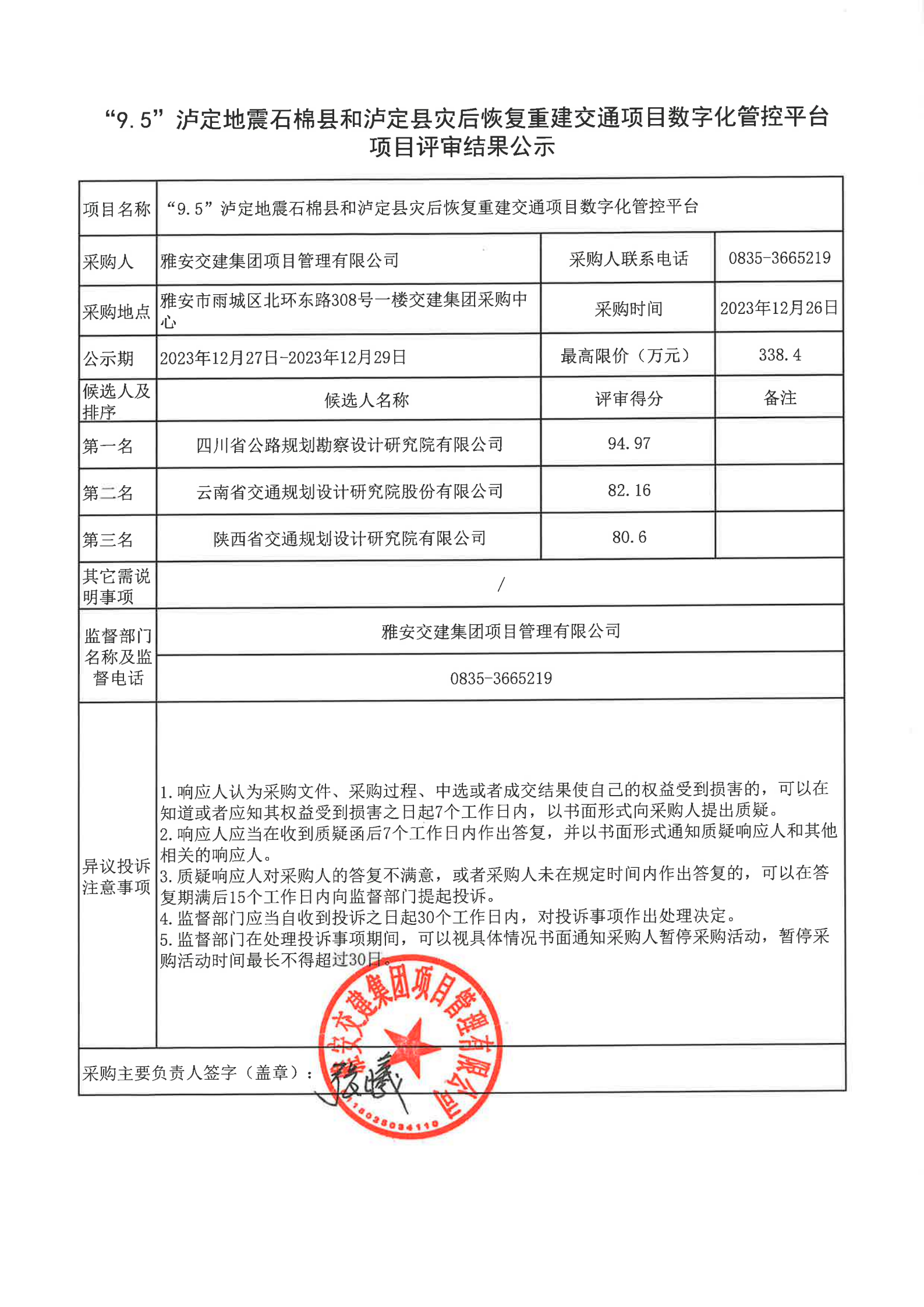 雅安交建集團項目管理有限公司“9.5”瀘定地震石棉縣和瀘定縣災(zāi)后恢復重建交通項目數(shù)字化管控平臺項目評審結(jié)果公示