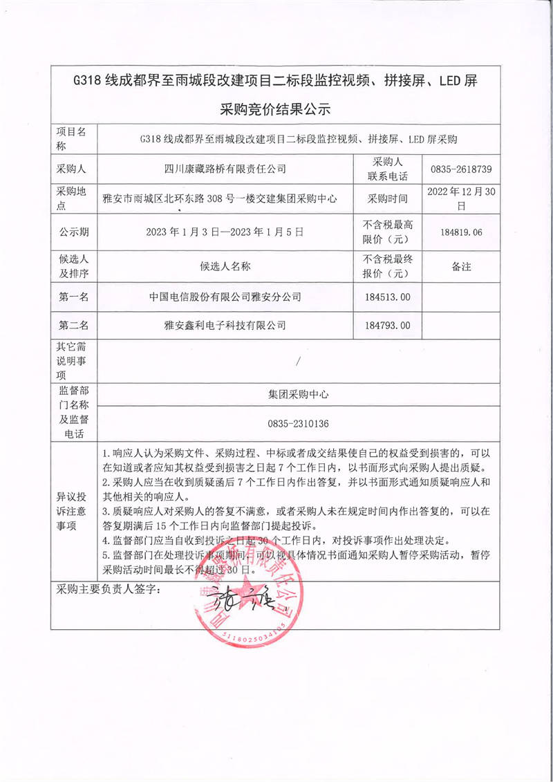 四川康藏路橋有限責(zé)任公司G318線成都界至雨城段改建項(xiàng)目二標(biāo)段監(jiān)控視頻、拼接屏、LED屏采購競價結(jié)果公示