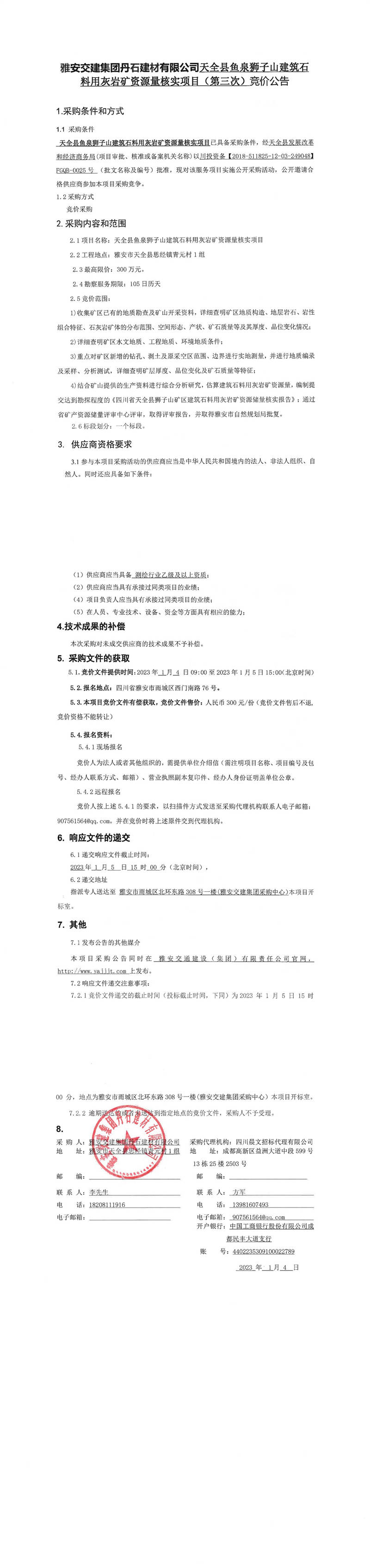雅安交建集團(tuán)丹石建材有限公司天全縣魚泉獅子山建筑石料用灰?guī)r礦資源量核實項目(第三次)競價公告