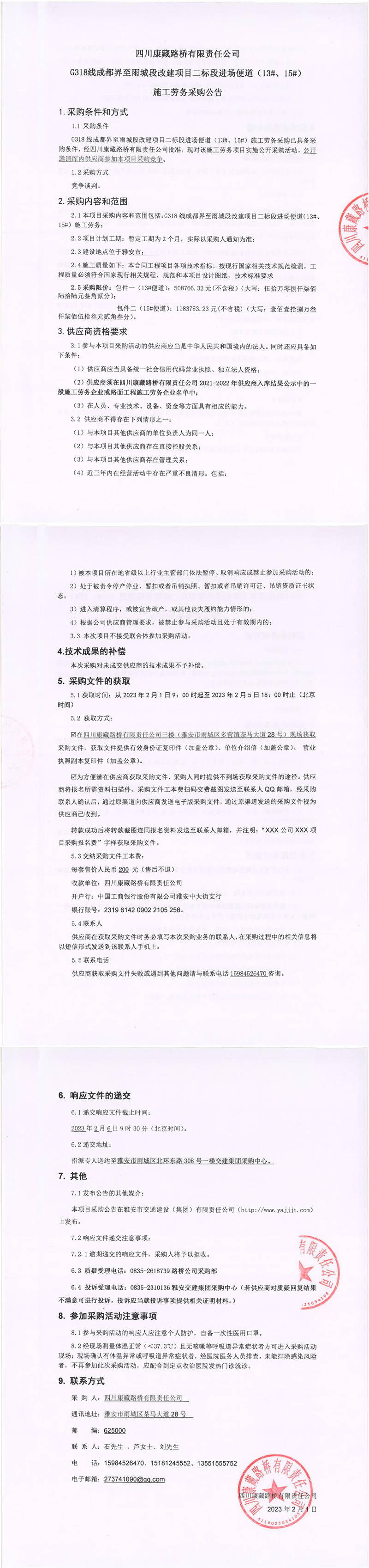 四川康藏路橋有限責(zé)任公司G318線成都界至雨城段改建項目二標(biāo)段進場便道(13#、15#)施工勞務(wù)采購公告