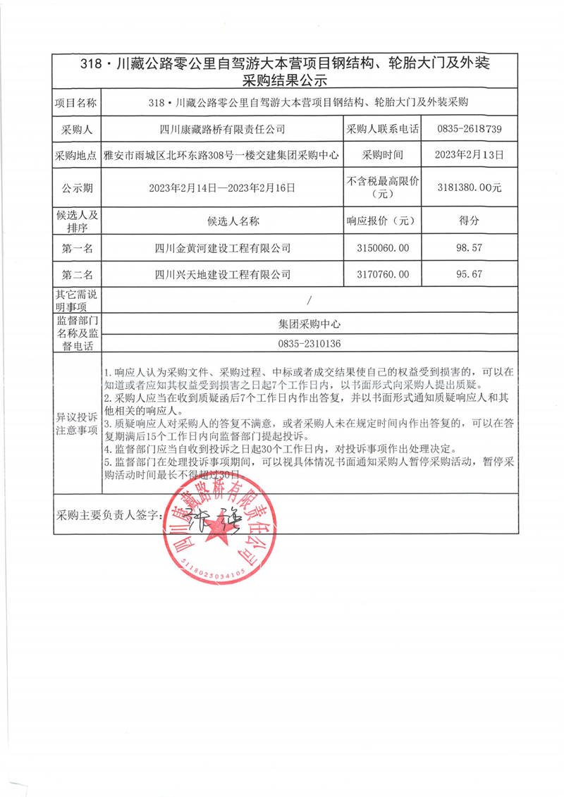 四川康藏路橋有限責(zé)任公司318.川藏公路零公里自駕游大本營項(xiàng)目鋼結(jié)構(gòu)、輪胎大門及外裝采購結(jié)果公示