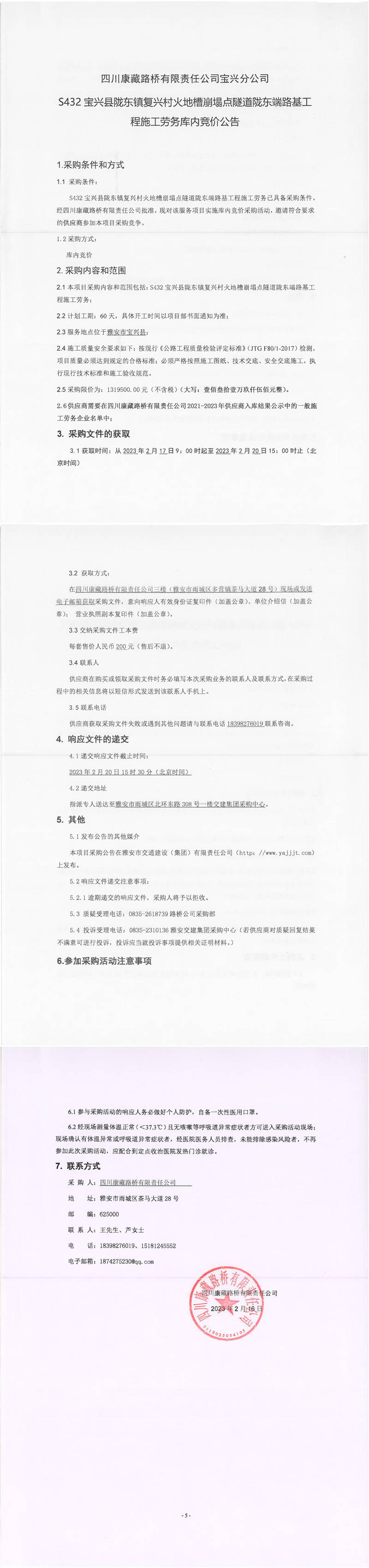 四川康藏路橋有限責任公司S432線寶興縣兩河口至甘孜界段災毀修復整治工程項目五龍改線段(K4+300-K5+740)段施工勞務公告