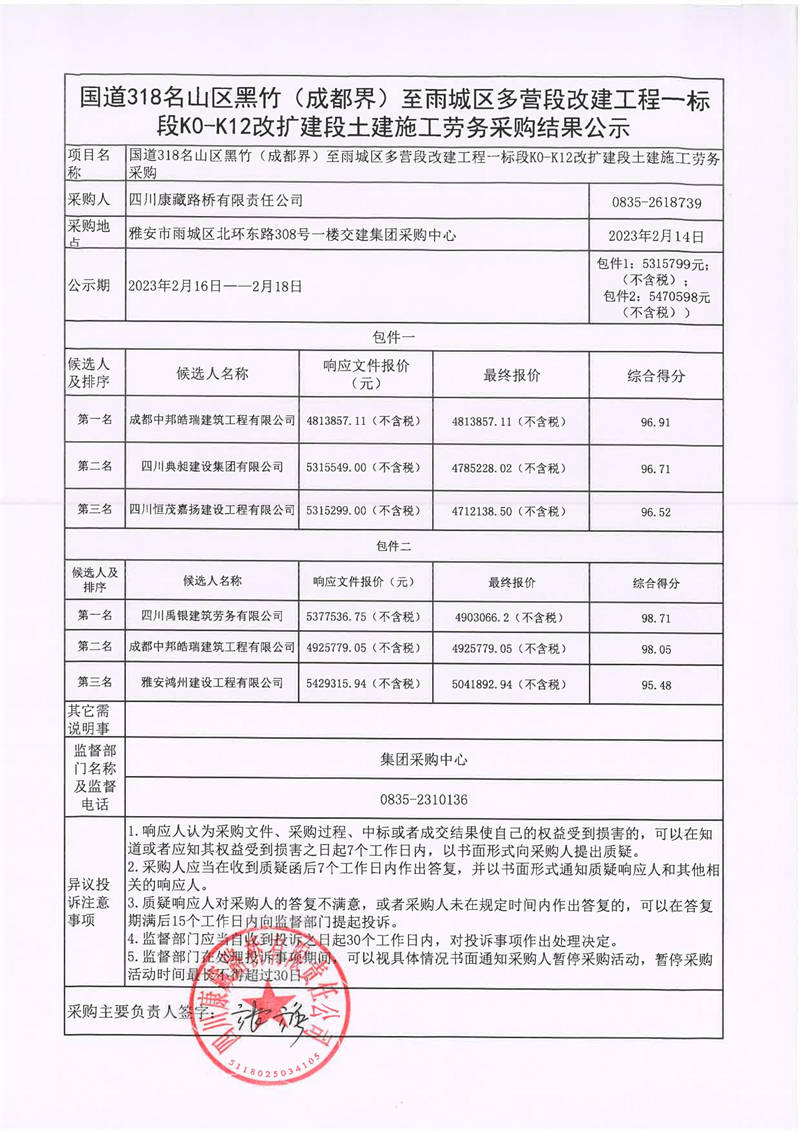 四川康藏路橋有限責任公司國道318名山區(qū)黑竹(成都界)至雨城區(qū)多營段改建工程一標段K0-K12改擴建段土建施工勞務采購結果公示