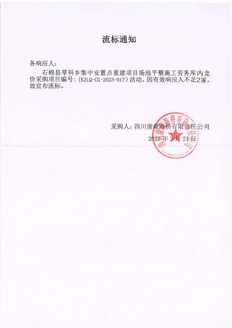 四川康藏路橋有限責(zé)任公司石棉草科鄉(xiāng)集中安置點重建項目場地平整施工勞務(wù)庫內(nèi)競價流標通知