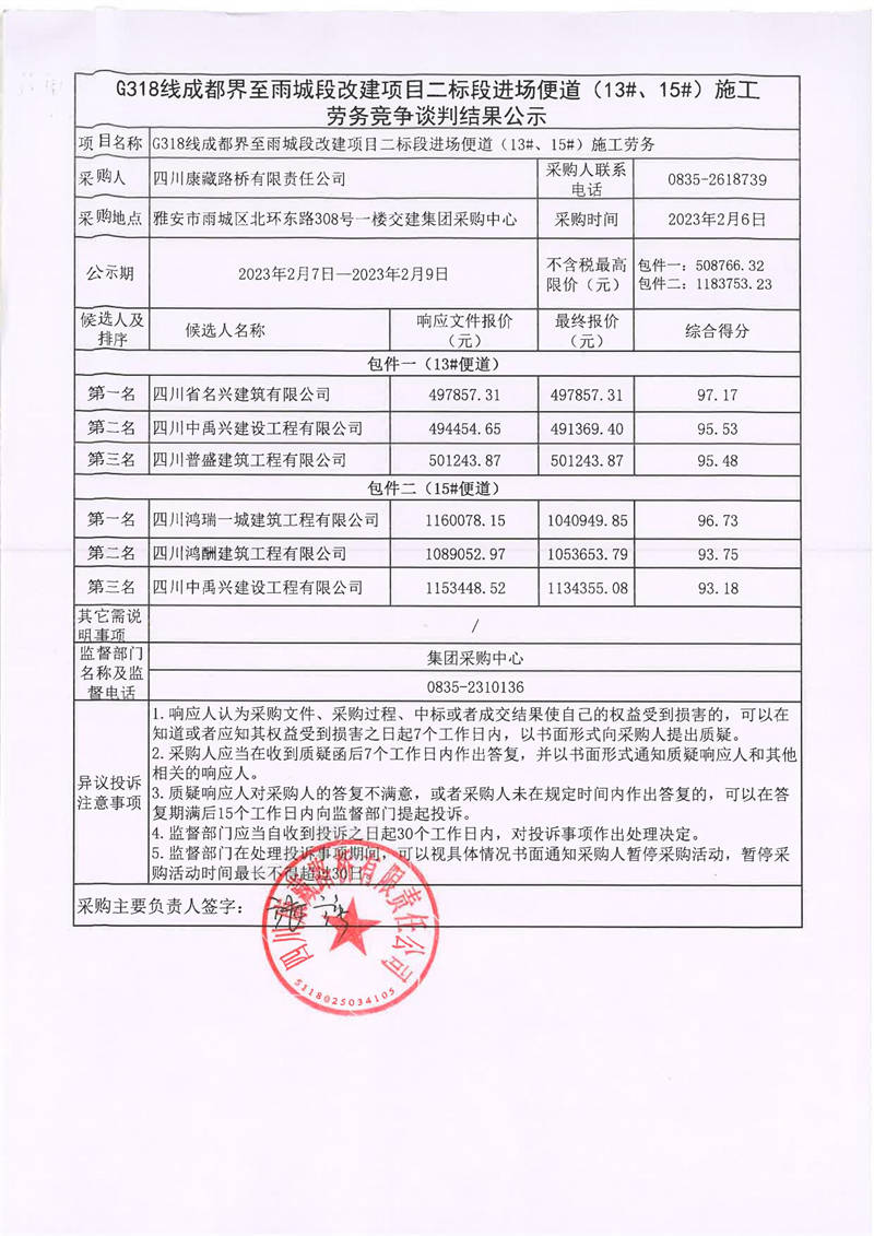 四川康藏路橋有限責任公司G318線成都界至雨城段改建項目二標段進場便道(13#、15#)施工勞務(wù)競爭談判結(jié)果公示