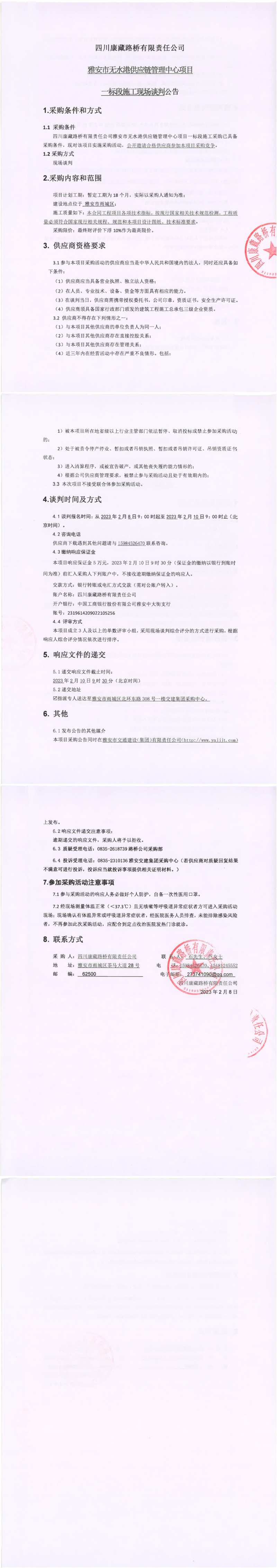 四川康藏路橋有限責(zé)任公司雅安市無水港供應(yīng)鏈管理中心項(xiàng)目一標(biāo)段施工現(xiàn)場談判公告