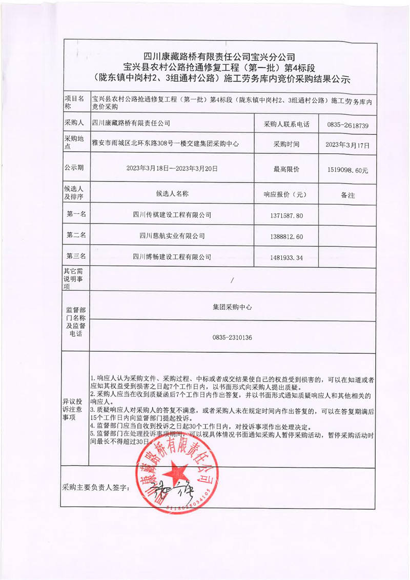 四川康藏路橋有限責任公司寶興分公司寶興縣農村公路搶通修復工程(第一批)第4標段(隴東鎮(zhèn)中崗村2、3組通村公路)施工勞務庫內競價采購結果公示