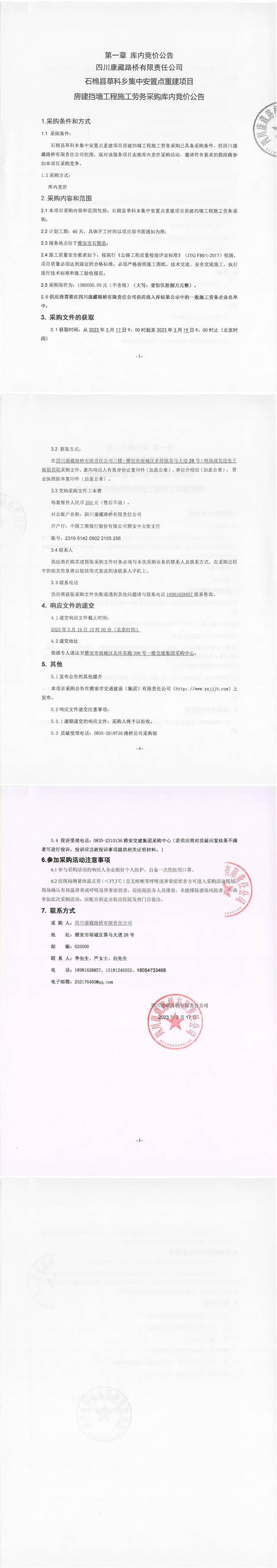 四川康藏路橋有限責任公司石棉草科鄉(xiāng)集中安置點重建項目房建擋墻工程施工勞務采購庫內競價公告
