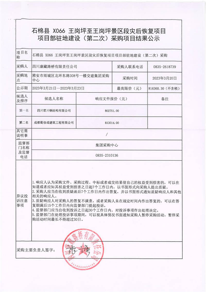 四川康藏路橋有限責(zé)任公司石棉縣X066王崗坪至王崗坪景區(qū)段災(zāi)后恢項(xiàng)目項(xiàng)目駐地建設(shè)(第二次)采購結(jié)果公示