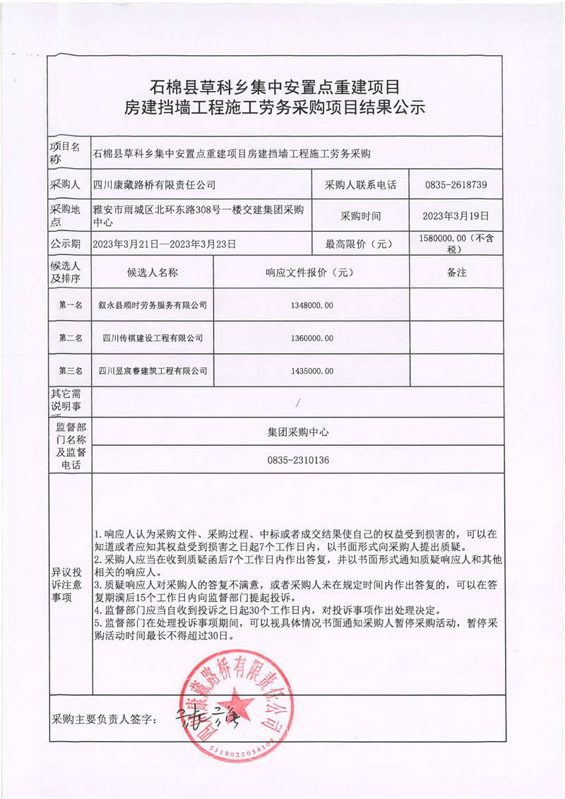 四川康藏路橋有限責(zé)任公司石棉縣草科鄉(xiāng)集中安置點(diǎn)重建項(xiàng)目房建擋墻工程施工勞務(wù)采購項(xiàng)目結(jié)果公示