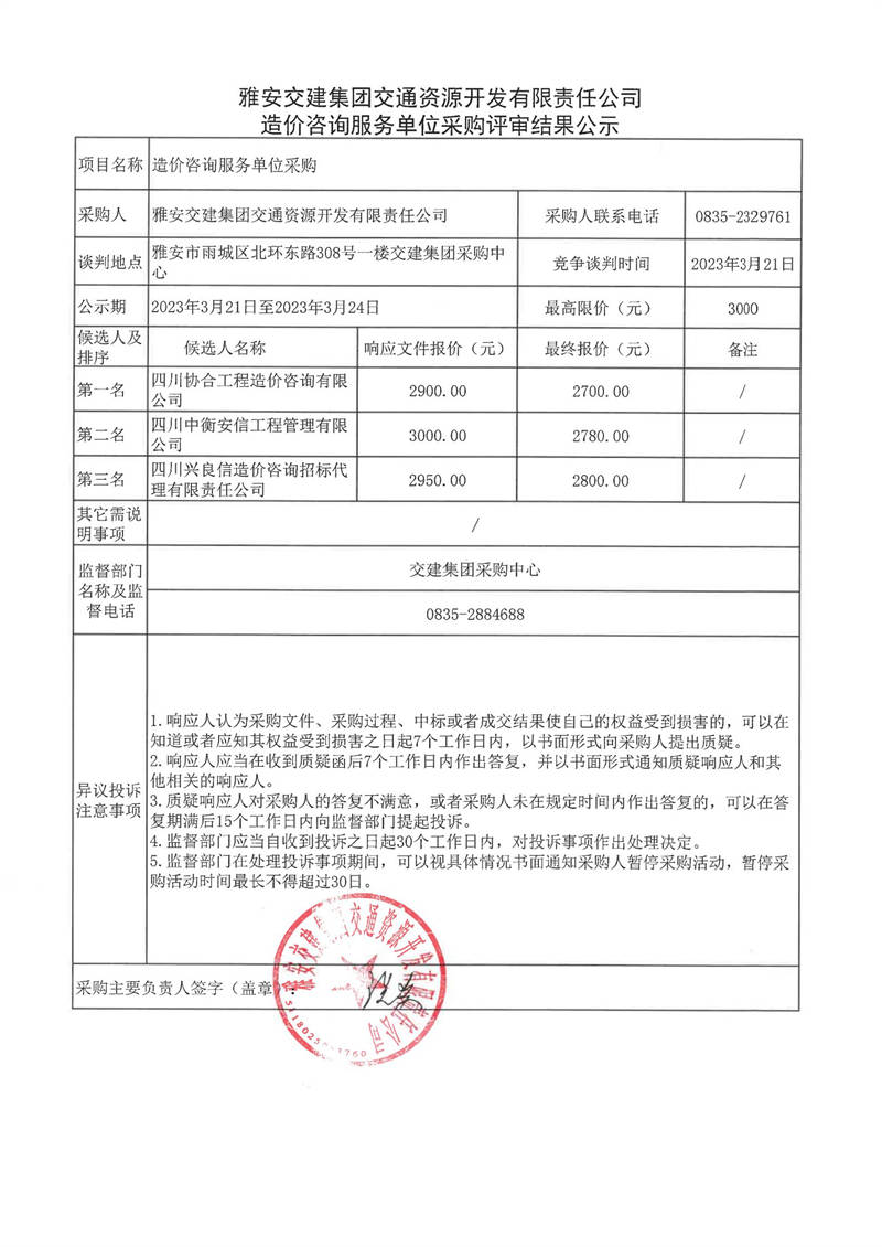 雅安交建集團(tuán)交通資源開發(fā)有限責(zé)任公司造價咨詢服務(wù)單位采購評審結(jié)果公示