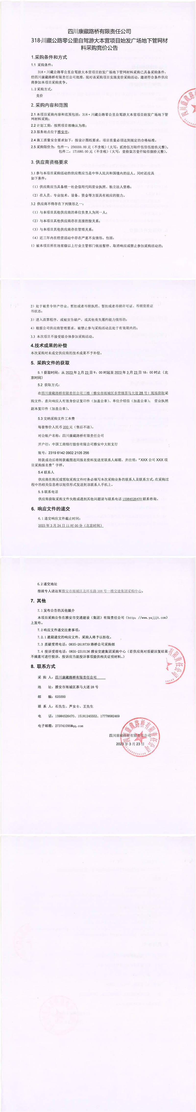 四川康藏路橋有限責(zé)任公司318·川藏公路零公里自駕游大本營(yíng)項(xiàng)目始發(fā)廣場(chǎng)地下管網(wǎng)材料采購(gòu)競(jìng)價(jià)公告