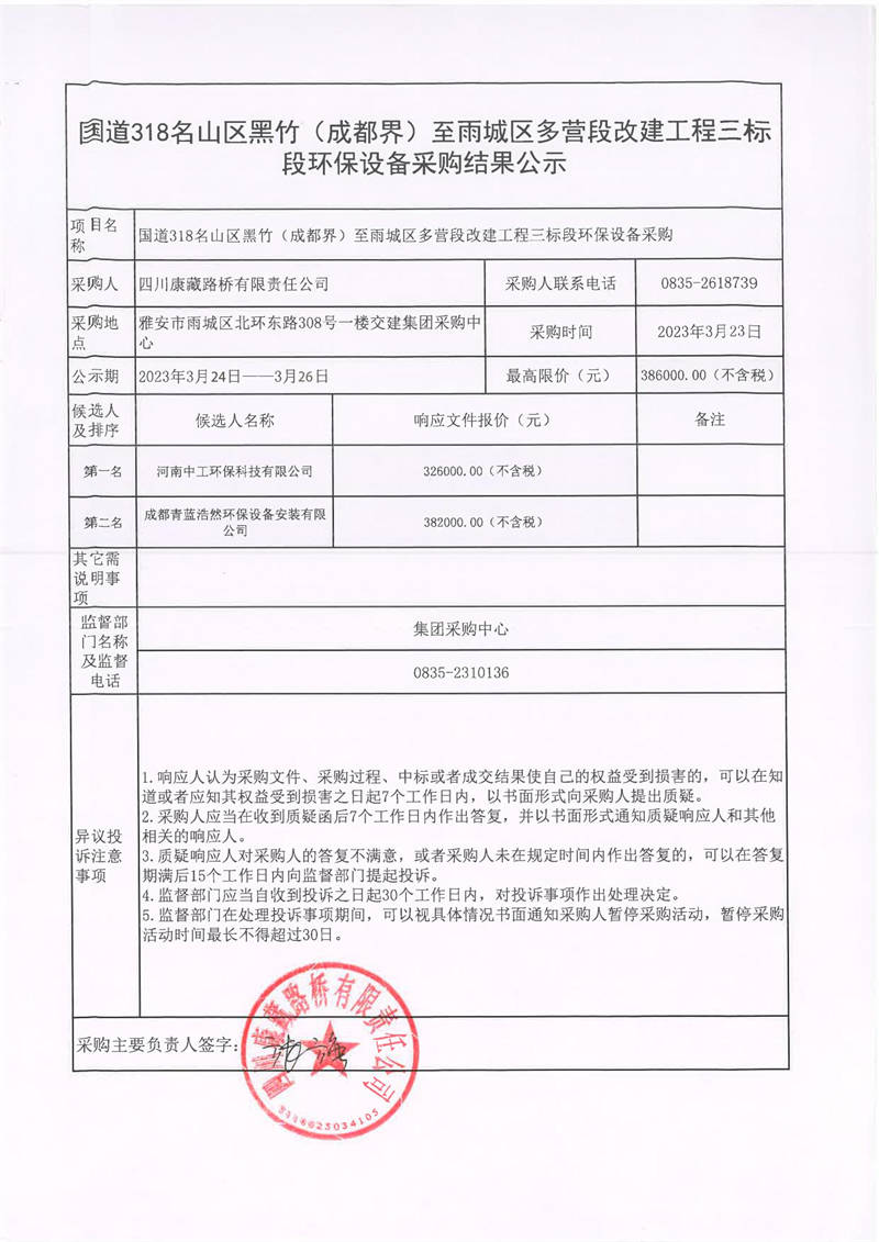 四川康藏路橋有限責(zé)任公司國道318名山區(qū)黑竹(成都界)至雨城區(qū)多營段改建工程三標(biāo)段環(huán)保設(shè)備采購結(jié)果公示