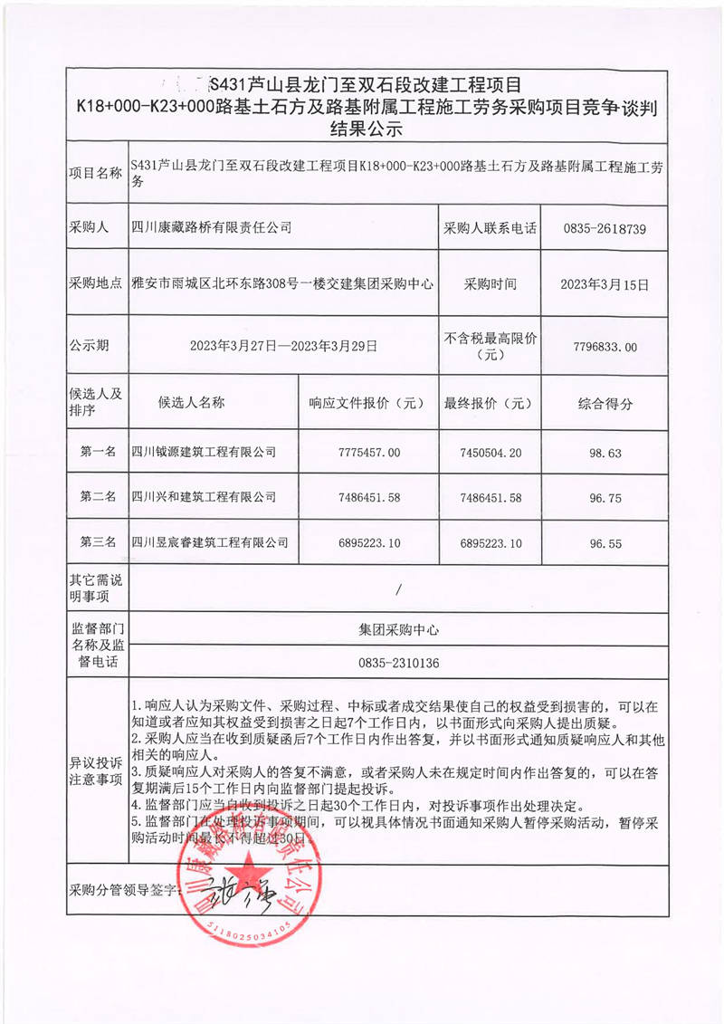 四川康藏路橋有限責任公司S431蘆山縣龍門至雙石段改建工程項目K18+000-K23+000路路基附屬工程施工勞務(wù)采購項目競爭談判結(jié)果公示