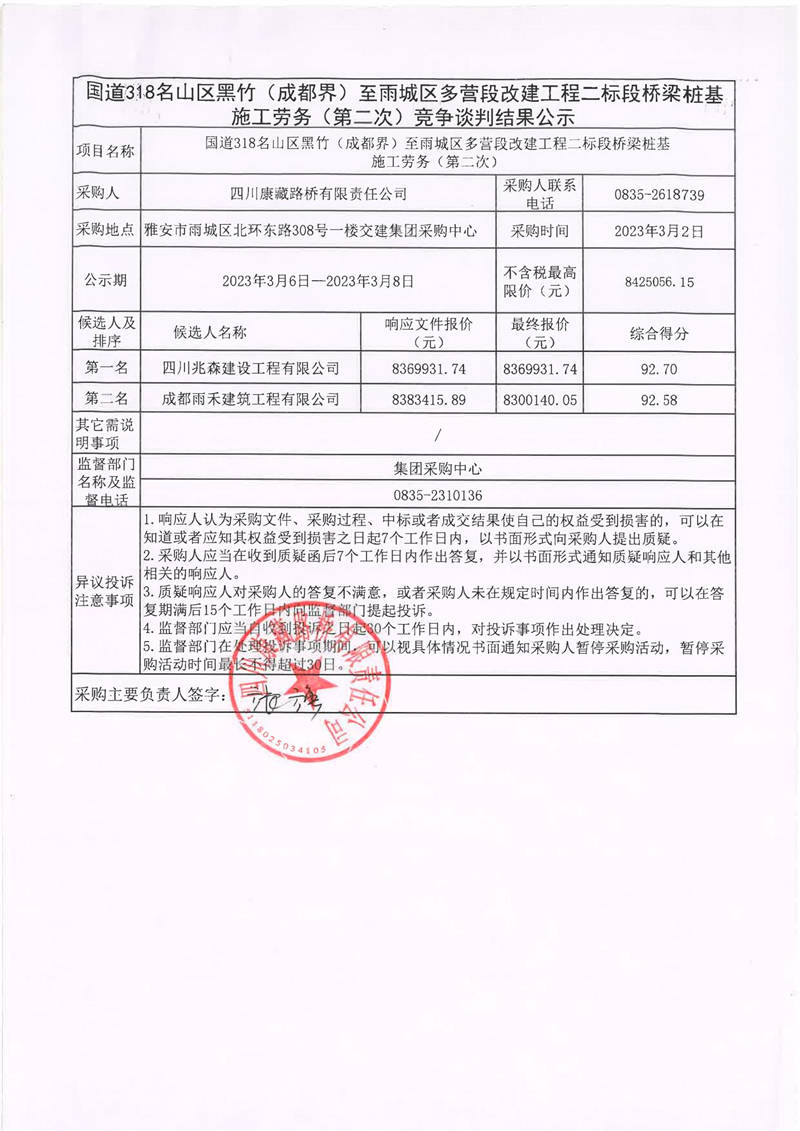 四川康藏路橋有限責(zé)任公司國道318名山區(qū)黑竹(成都界)至雨城區(qū)多營段改建工程二標(biāo)段橋梁樁基施工勞務(wù)(第二次)競(jìng)爭(zhēng)談判結(jié)果公示