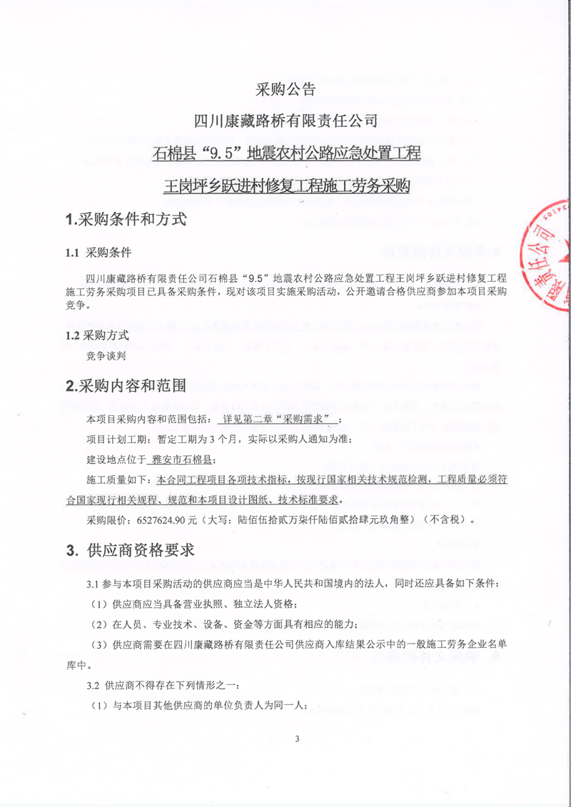 四川康藏路橋有限責任公司石棉縣“9.5”地震農(nóng)村公路應急處置工程王崗坪鄉(xiāng)躍進村修復工程施工勞務采購公告
