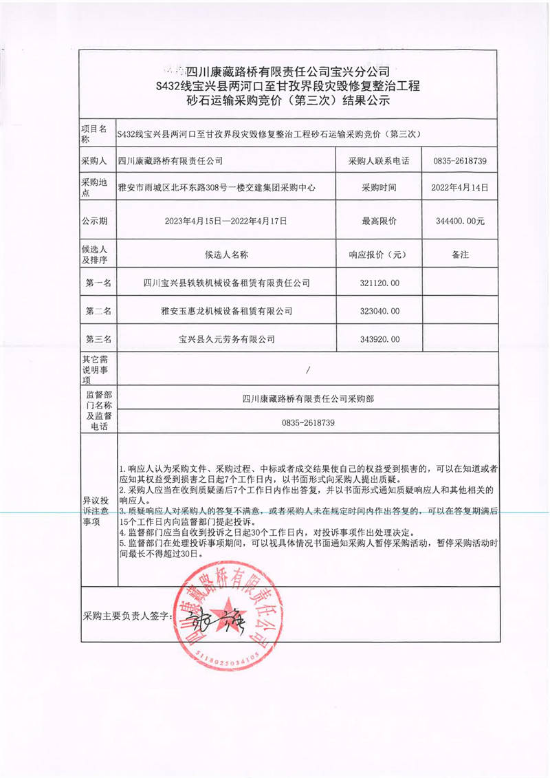 四川康藏路橋有限責任公司寶興分公司S432線寶興縣兩河口至甘孜界段災毀修復整治工程砂石運輸采購競價(第三次)結(jié)果公示