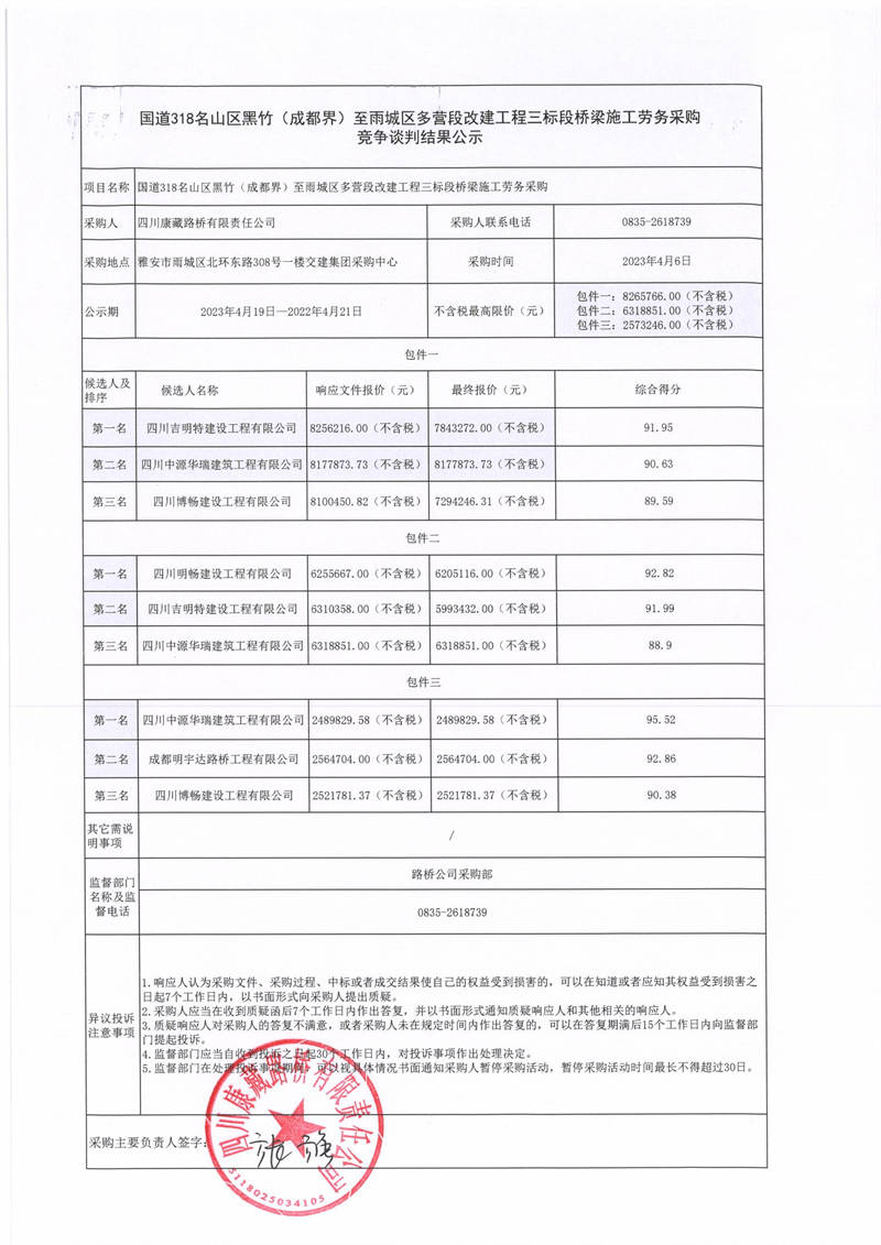 四川康藏路橋有限責(zé)任公司國道318名山區(qū)黑竹(成都界)至雨城區(qū)多營段改建工程三標(biāo)段橋梁施工勞務(wù)采購競爭談判結(jié)果公示