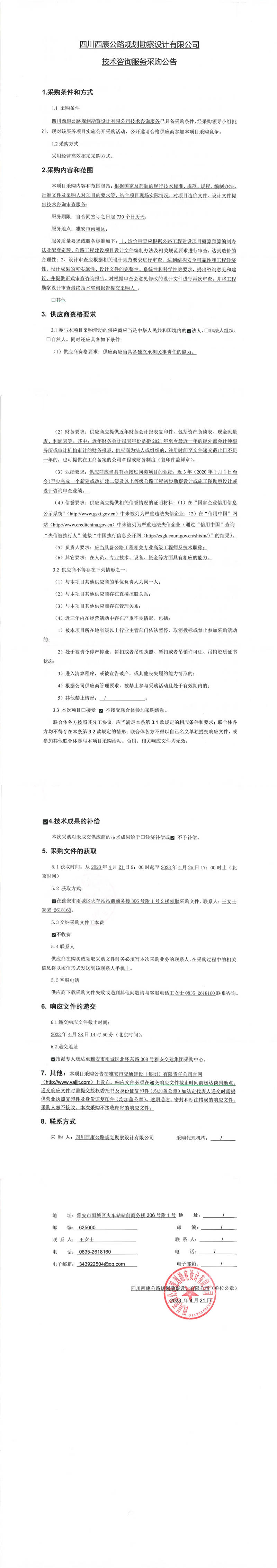 四川西康公路規(guī)劃勘察設(shè)計(jì)有限公司技術(shù)服務(wù)采購(gòu)公告