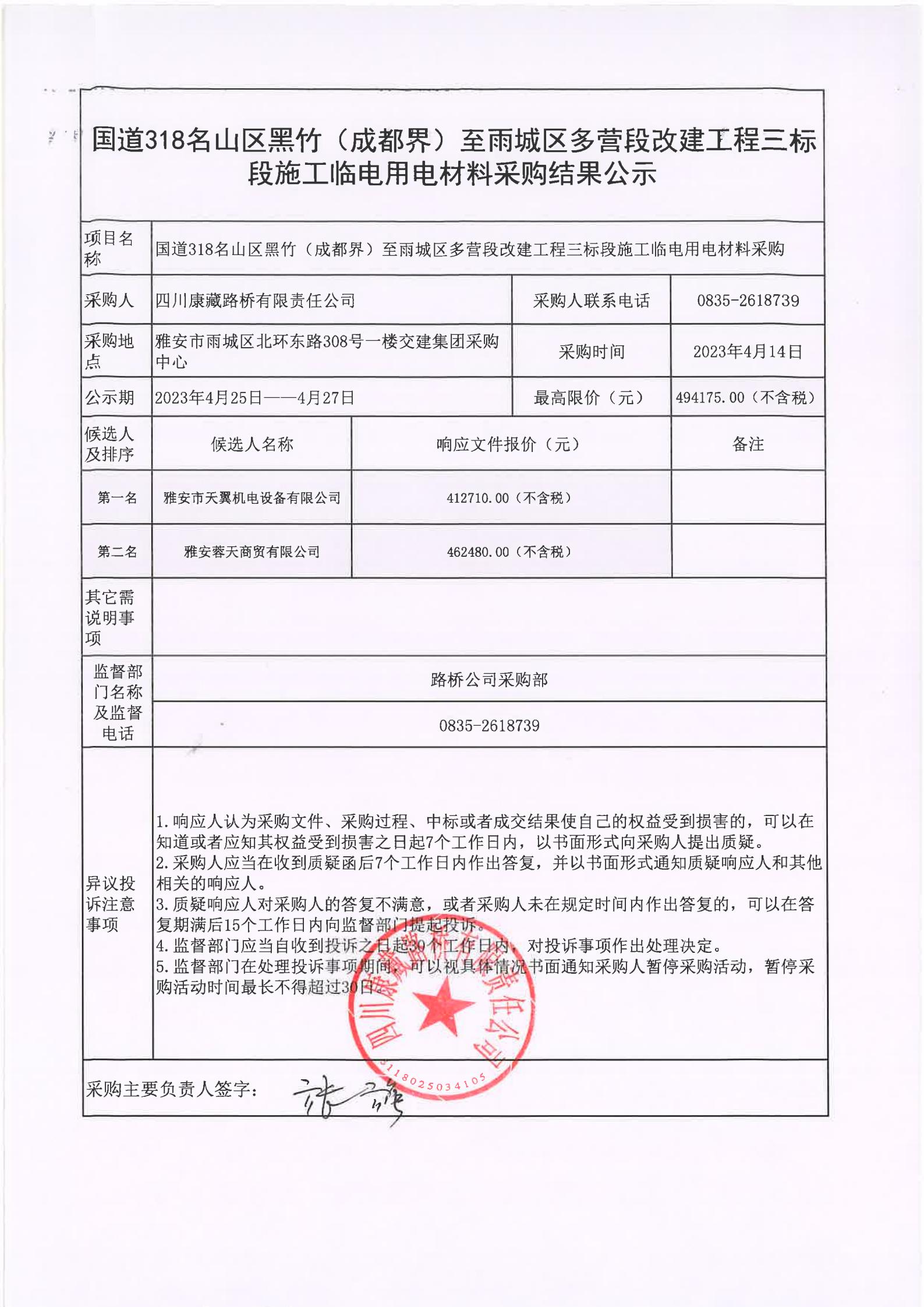 四川康藏路橋有限責(zé)任公司國(guó)道318名山區(qū)黑竹(成都界)至雨城區(qū)多營(yíng)段改建工程三標(biāo)段施工臨電用電材料采購(gòu)結(jié)果公示