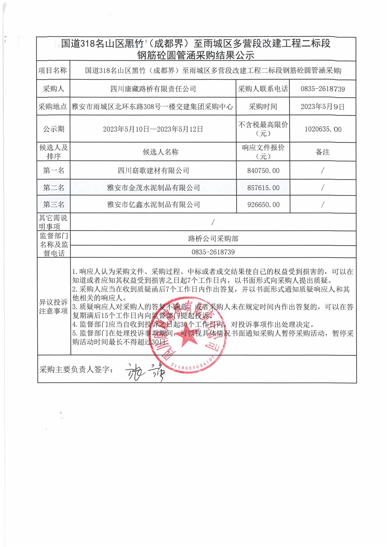 四川康藏路橋有限責(zé)任公司國(guó)道318名山區(qū)黑竹(成都界)至雨城區(qū)多營(yíng)段改建工程二標(biāo)段鋼筋砼圓管涵采購(gòu)結(jié)果公示