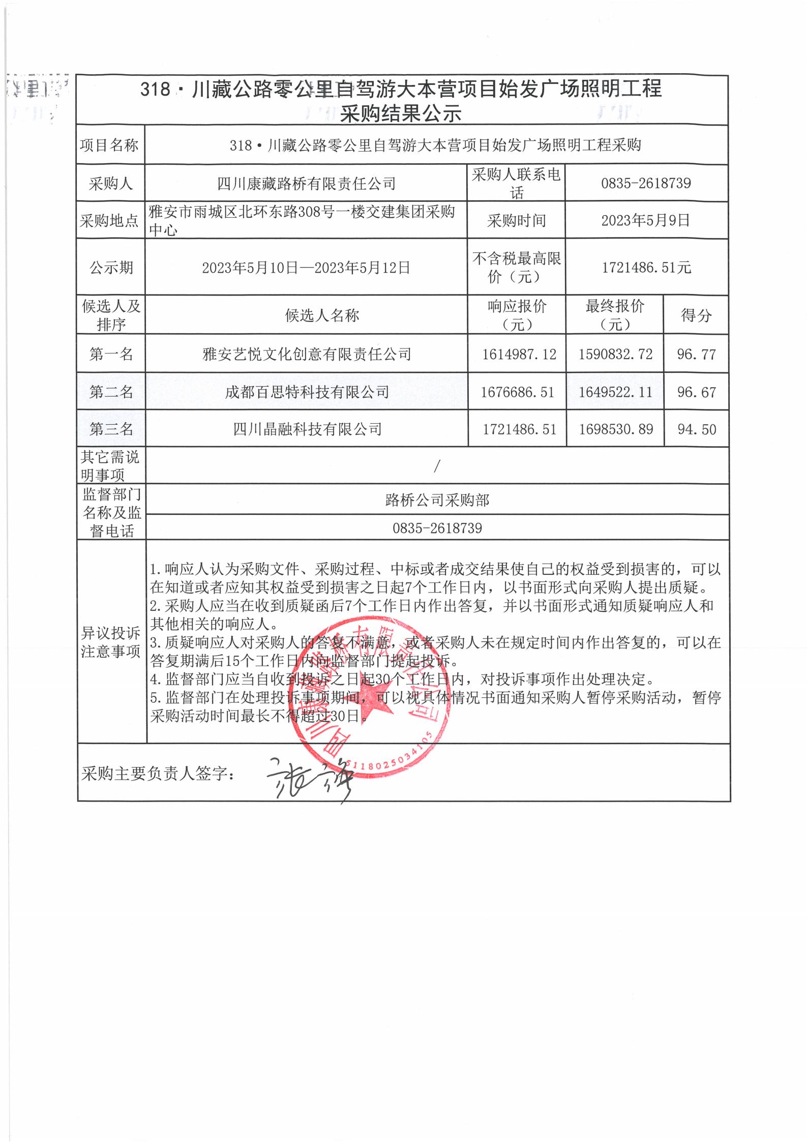 四川康藏路橋有限責任公司318·川藏公路零公里自駕游大本營項目始發(fā)廣場照明工程采購結果公示