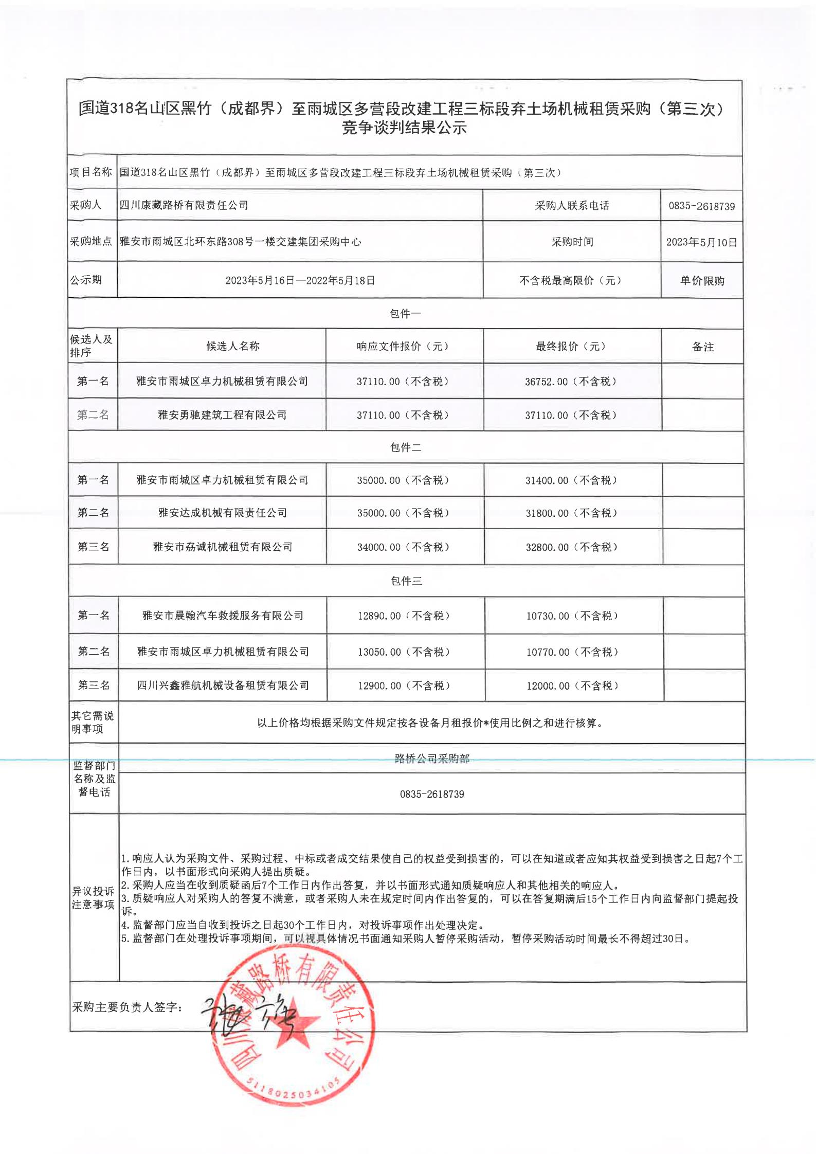 四川康藏路橋有限責(zé)任公司國道318名山區(qū)黑竹(成都界)至雨城區(qū)多營段改建工程三標(biāo)段棄土場(chǎng)機(jī)械租賃采購(第三次)競(jìng)爭(zhēng)談判結(jié)果公示