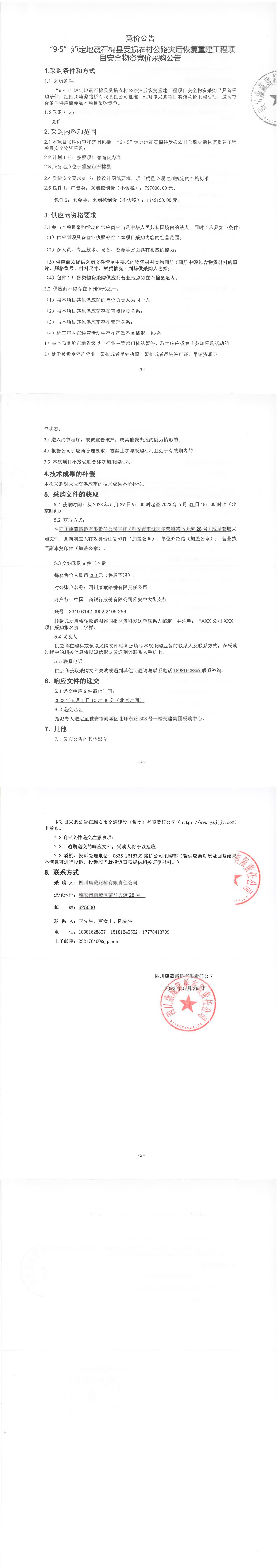 四川康藏路橋有限責(zé)任公司“9.5”瀘定地震石棉縣受損農(nóng)村公路災(zāi)后恢復(fù)重建工程項(xiàng)目安全物資競(jìng)價(jià)采購(gòu)公告