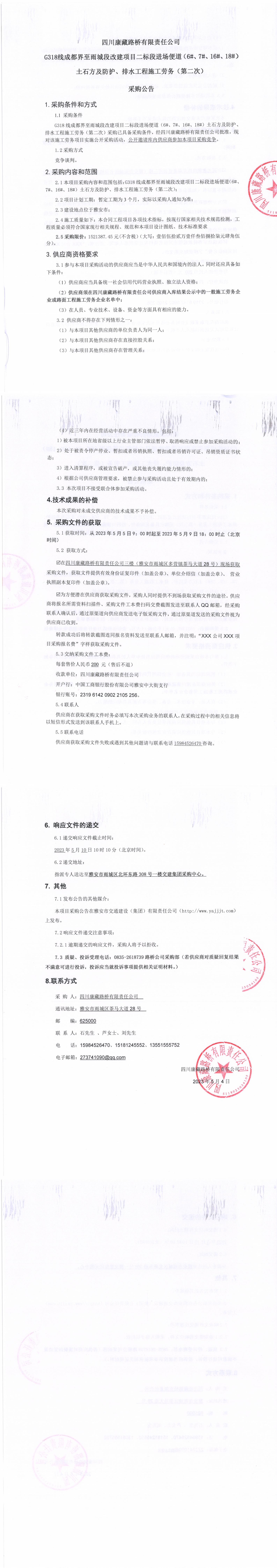 四川康藏路橋有限責任公司G318線成都至雨城段改建項目二標段進場便道(6#、7#、16#、18#)土石方及防護、排水工程施工勞務(第二次)采購公告