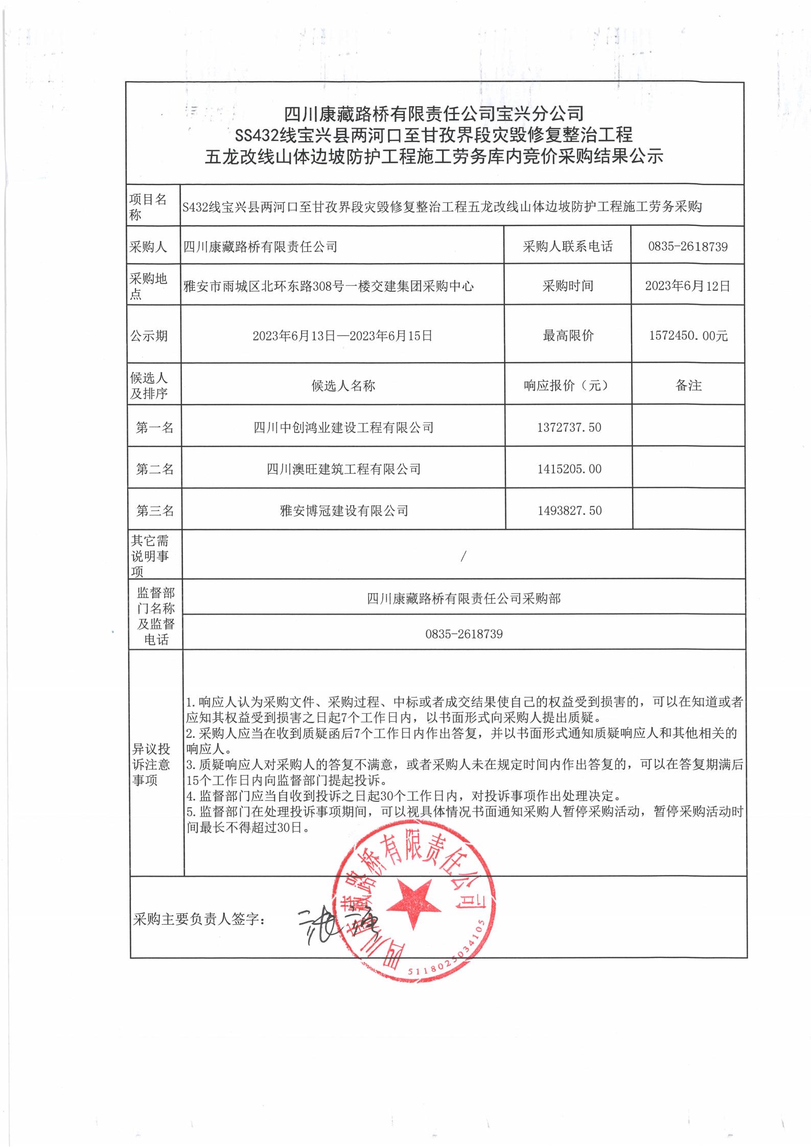 四川康藏路橋有限責(zé)任公司S432線寶興縣兩河口至甘孜界段災(zāi)毀修復(fù)整治工程五龍改線山體邊坡防護(hù)施工勞務(wù)庫(kù)內(nèi)競(jìng)價(jià)采購(gòu)結(jié)果公示