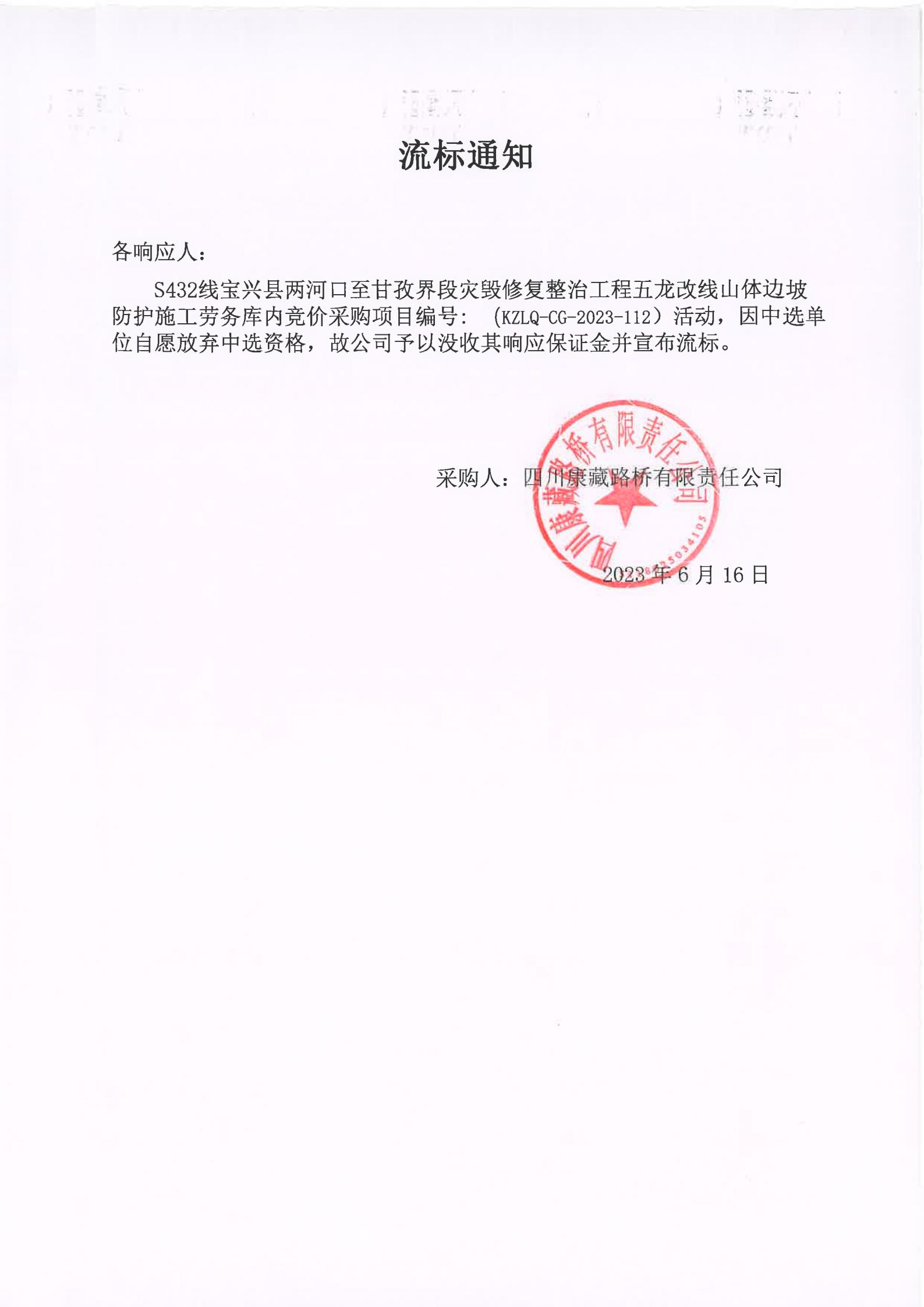 四川康藏路橋有限責(zé)任公司S432線寶興縣兩河口至甘孜界段災(zāi)毀修復(fù)整治工程五龍改線山體邊坡防護(hù)施工勞務(wù)庫內(nèi)競價(jià)流標(biāo)通知
