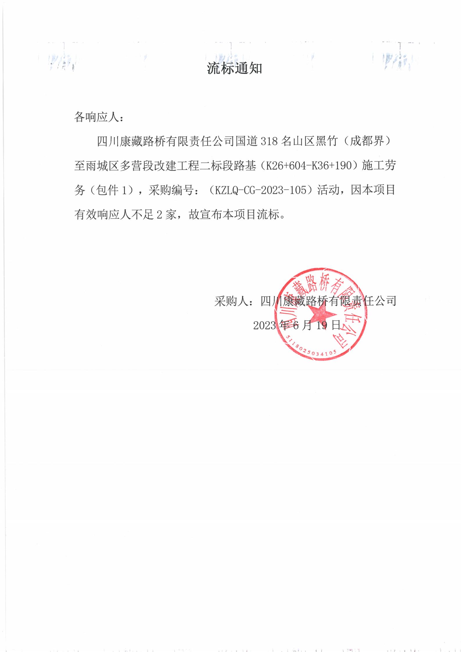 四川康藏路橋有限責任公司國道318名山區(qū)黑竹(成都界)至雨城區(qū)多營段改建工程二標段路基(K26+604-K36+190)施工勞務采購(包件1)流標通知