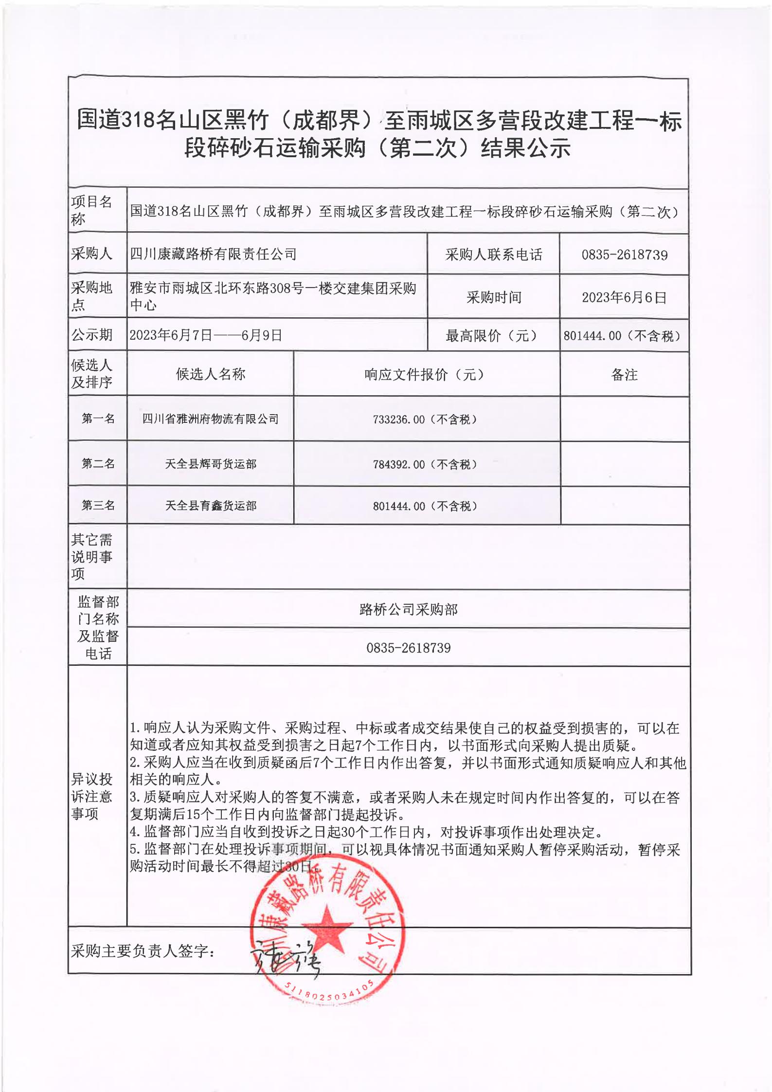 四川康藏路橋有限責(zé)任公司國道318名山區(qū)黑竹(成都界)至雨城區(qū)多營段改建工程一標(biāo)段碎砂石運輸采購(第二次)結(jié)果公示