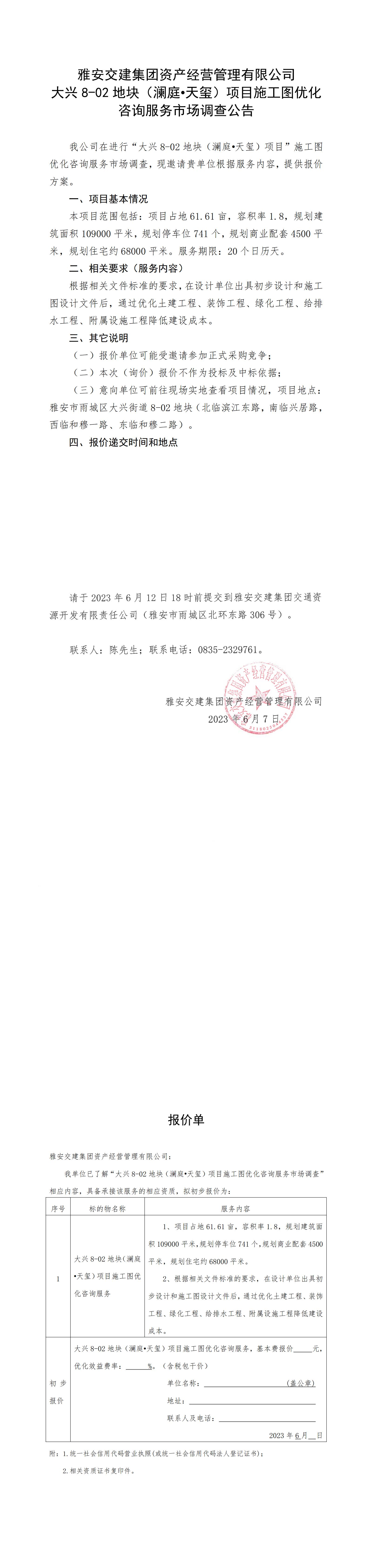 雅安交建集團(tuán)資產(chǎn)經(jīng)營管理有限公司大興8-02地塊(瀾庭·天璽)項(xiàng)目施工圖優(yōu)化咨詢服務(wù)市場調(diào)查公告