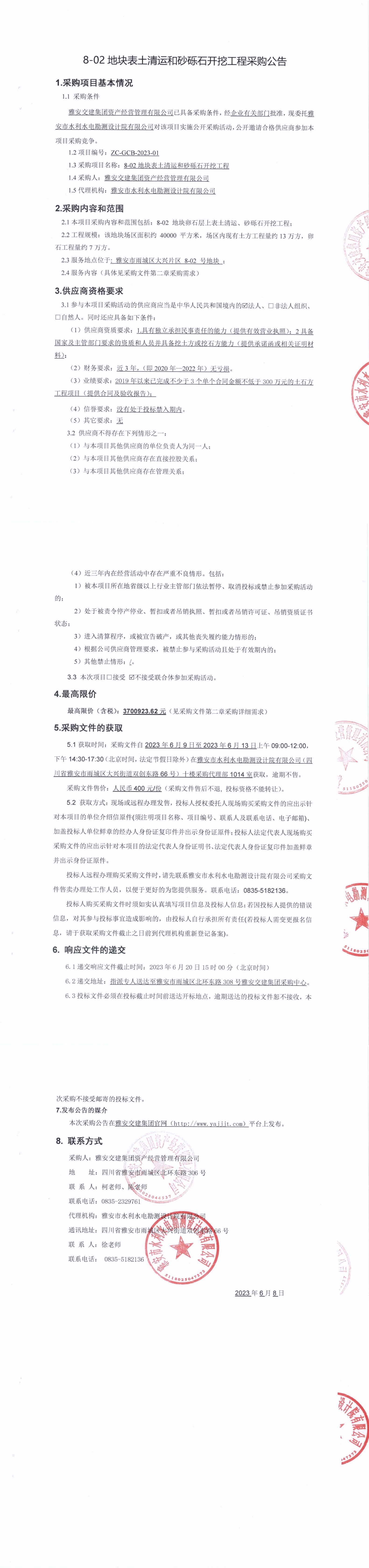 雅安交建集團(tuán)資產(chǎn)經(jīng)營管理有限公司8-02地塊表土清運(yùn)和砂礫石開挖工程采購公告