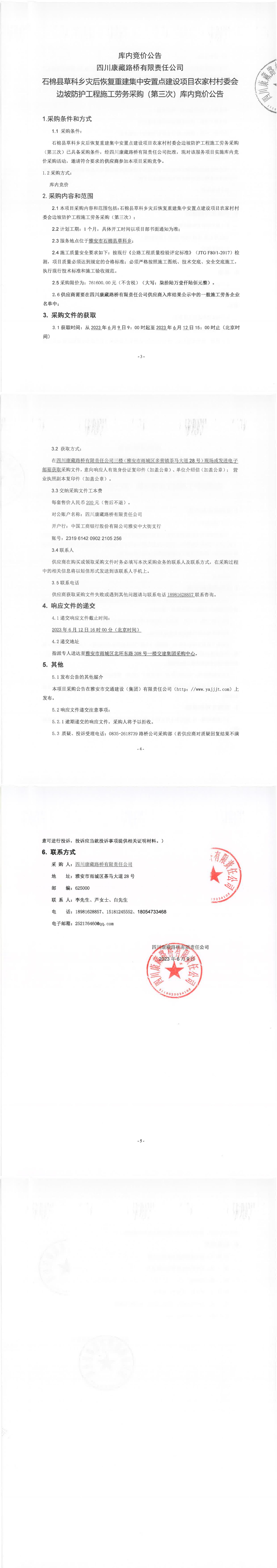 四川康藏路橋有限責任公司石棉縣草科鄉(xiāng)災后恢復重建集中安置點建設項目農家村村委會邊坡防護工程施工勞務采購(第三次)庫內競價公告
