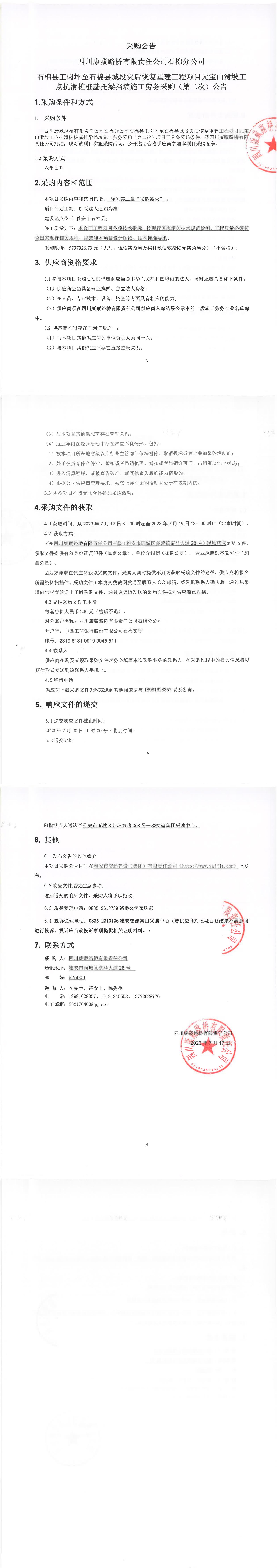 四川康藏路橋有限責任公司石棉分公司石棉縣王崗坪至石棉縣城段災(zāi)后恢復重建工程項目元寶山滑坡工點抗滑樁樁基托梁擋墻施工勞務(wù)采購(第二次)公告