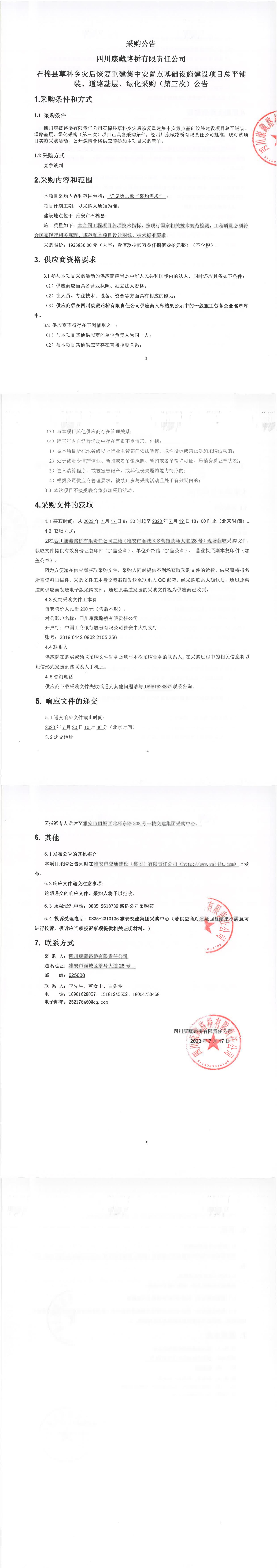 四川康藏路橋有限責(zé)任公司石棉縣草科鄉(xiāng)災(zāi)后恢復(fù)重建集中安置點(diǎn)基礎(chǔ)設(shè)施建設(shè)項(xiàng)目總平鋪裝、道路基層、綠化采購(gòu)(第三次)公告